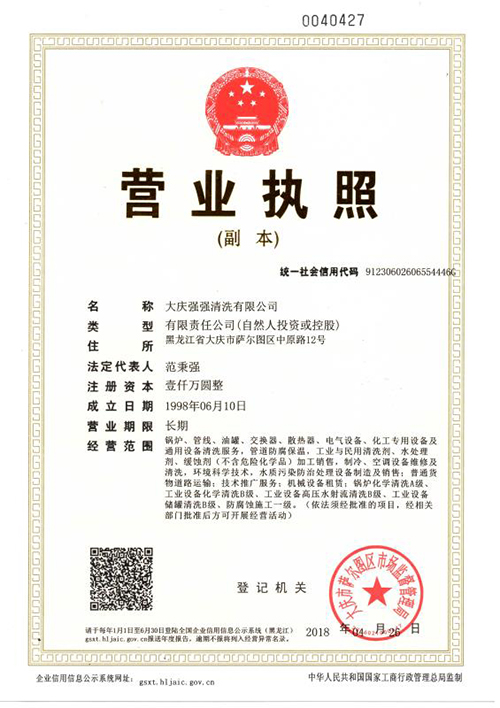 锅炉化学清洗单位资质评定证书副