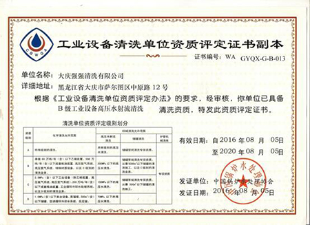 工业设备清洗单位资质评定证书副